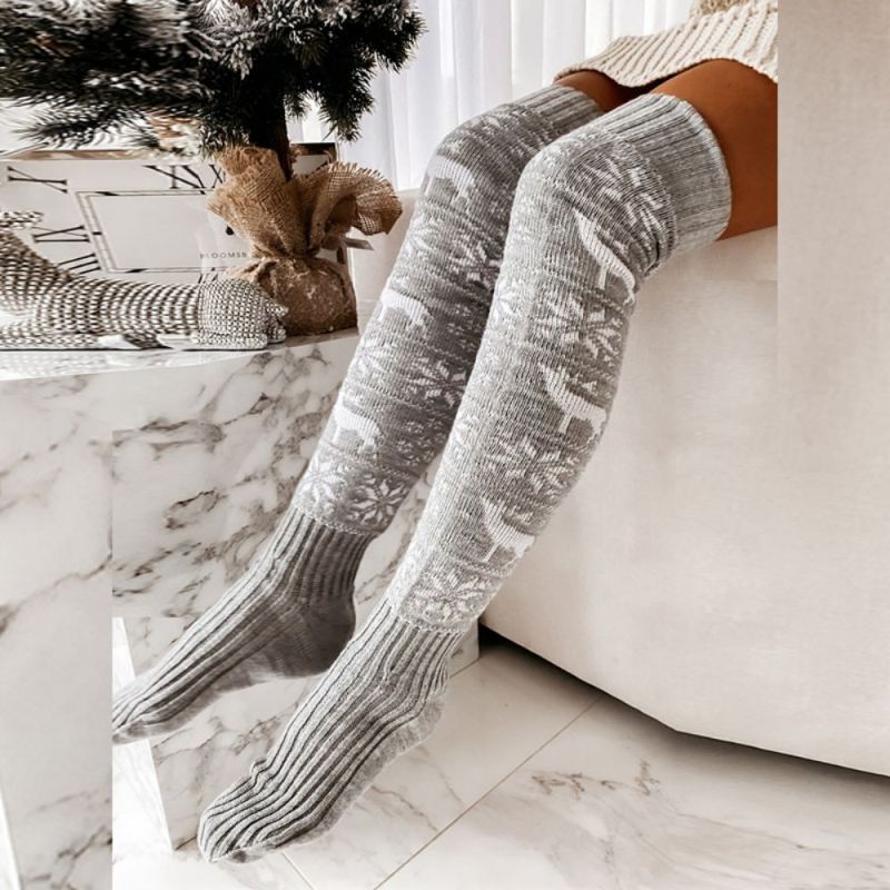 クリスマス雪柄エルクロングニットひざ丈重ね履きソックス女性用