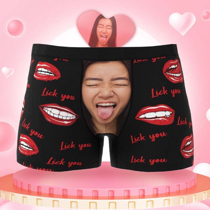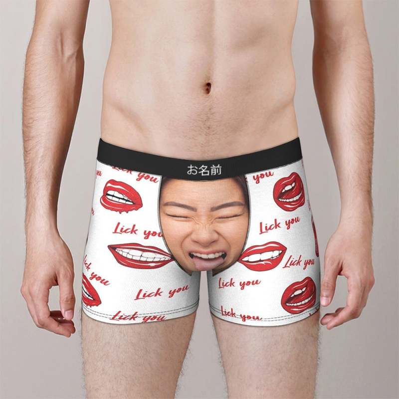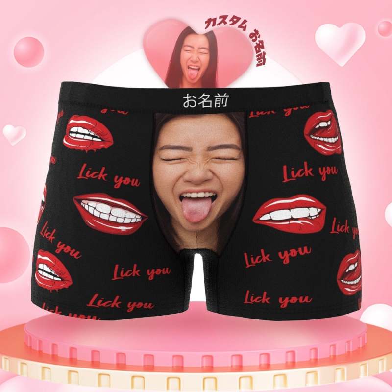 カスタムフォトボクサーパンツ-写真とテキスト入り可能な唇を舐める柄のオリジナル下着バレンタインプレゼント