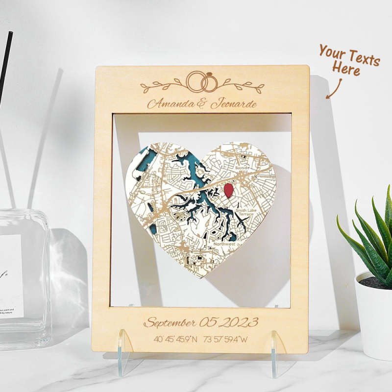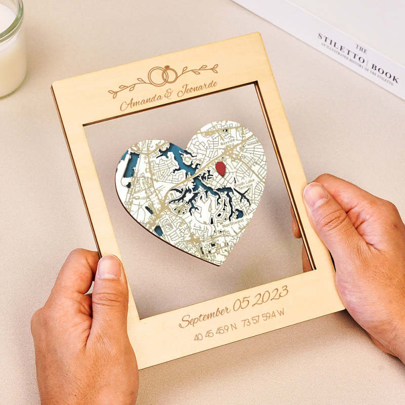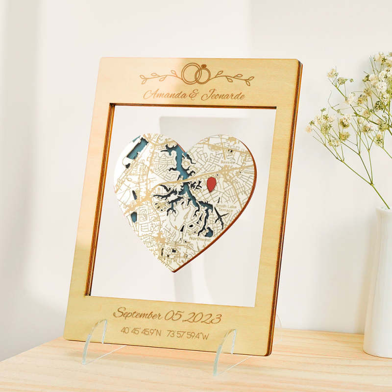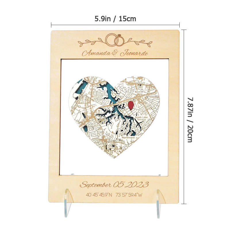 このカスタム木製アクリル卓上飾りは、特別な日を記念するユニークな方法です。ご希望の住所の地図とともにお名前と日付が入っているので、新居や婚約、結婚のお祝いの記念にぴったりの贈り物です。
