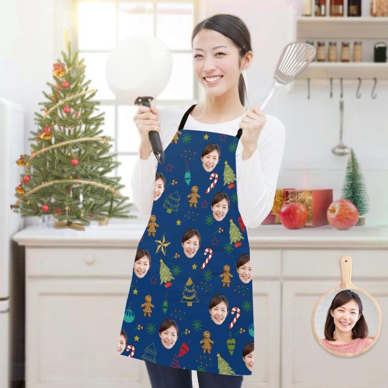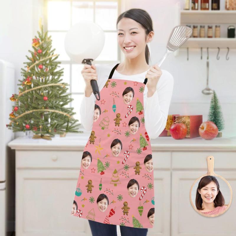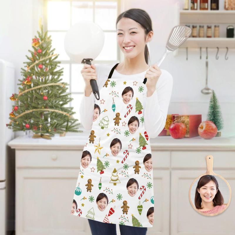 カスタムフォトエプロン-写真入れ可能なキッチン首掛け式クリスマスエプロンギフト-ジンジャーブレッド人とクリスマスツリー