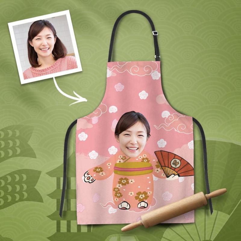 カスタムフォトエプロン-写真入れ可能なキッチン首掛け式エプロンギフト-和柄ピンクの着物 カスタムフォトエプロン-写真入れ可能なキッチン首掛け式エプロンギフト-和柄ピンクの着物
