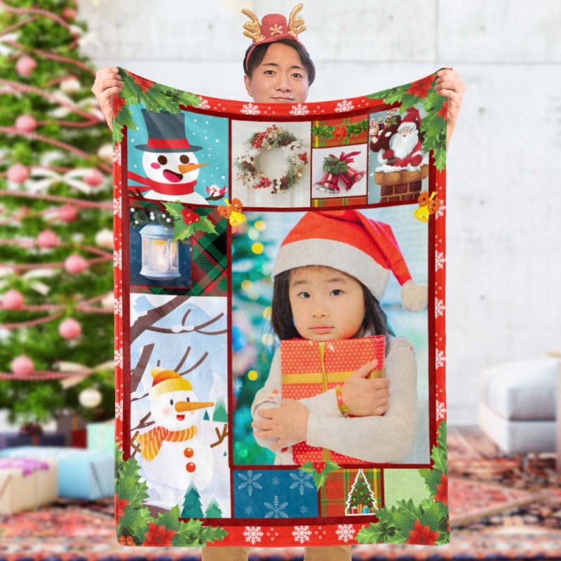 カスタムフォトブランケット-写真入れ可能なサクリスマスの雪だるま柄のフリース毛布子供へのクリスマスひざかけギフト