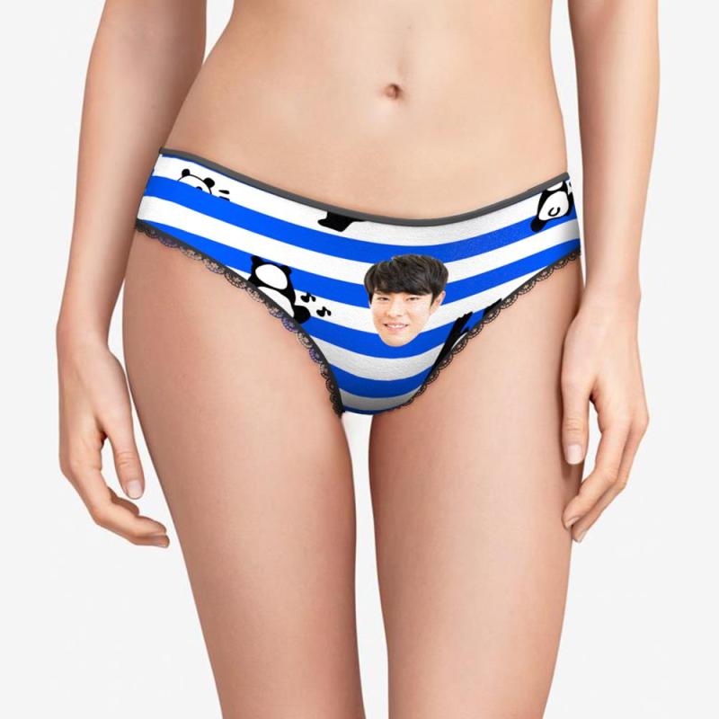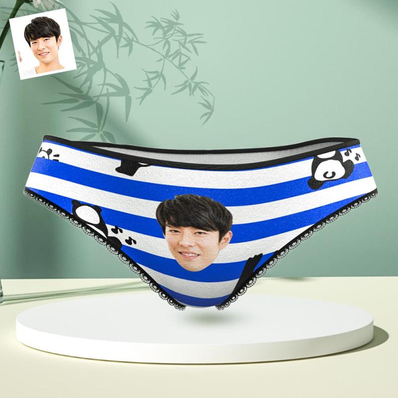 カスタムフォトパンティ-写真入れ可能な青い縞柄のよじ登るパンダの女性用下着