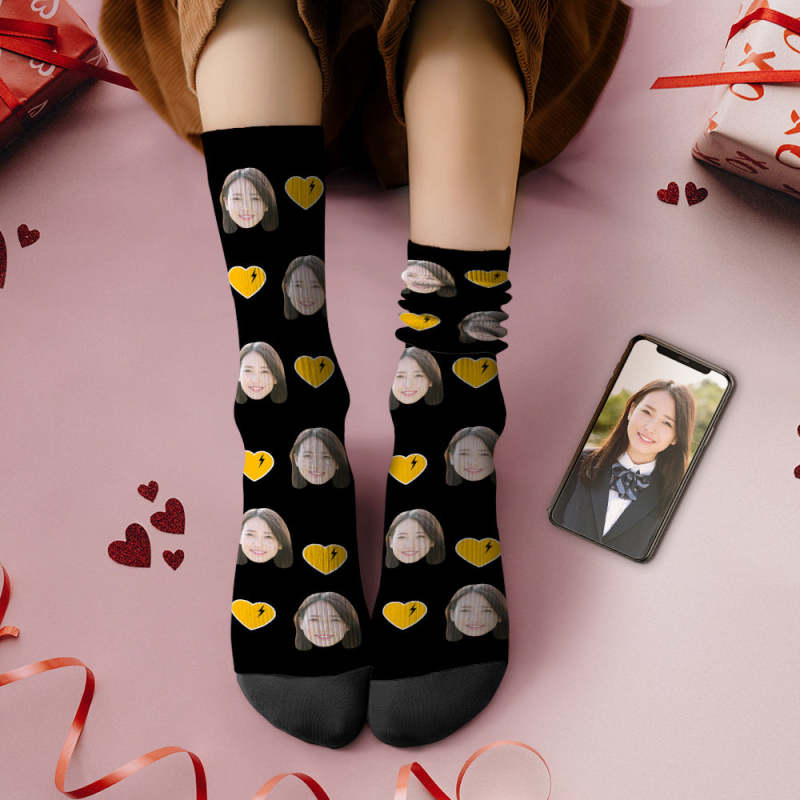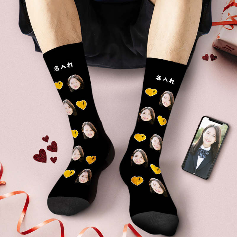 カスタムフォトソックス-思い出写真入れ名入れ可能なオリジナルバレンタイン靴下プレゼント-ハート形の稲妻柄