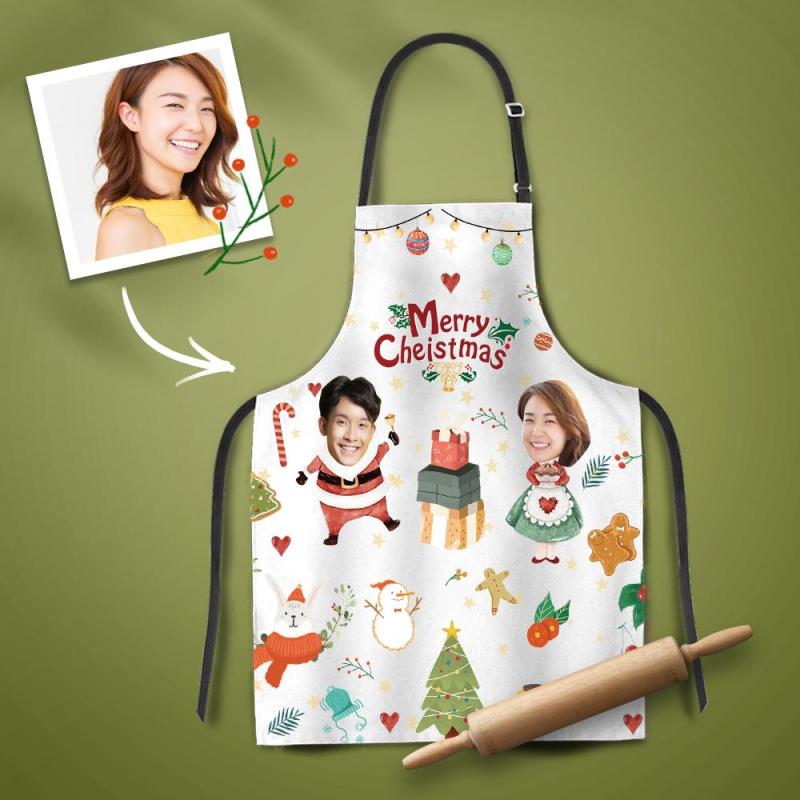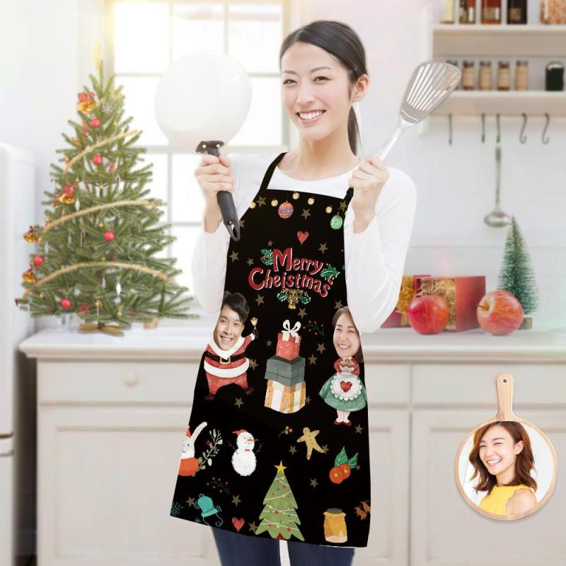 カスタムフォトエプロン-二つの顔写真入れ可能なキッチン首掛け式クリスマスエプロンギフト