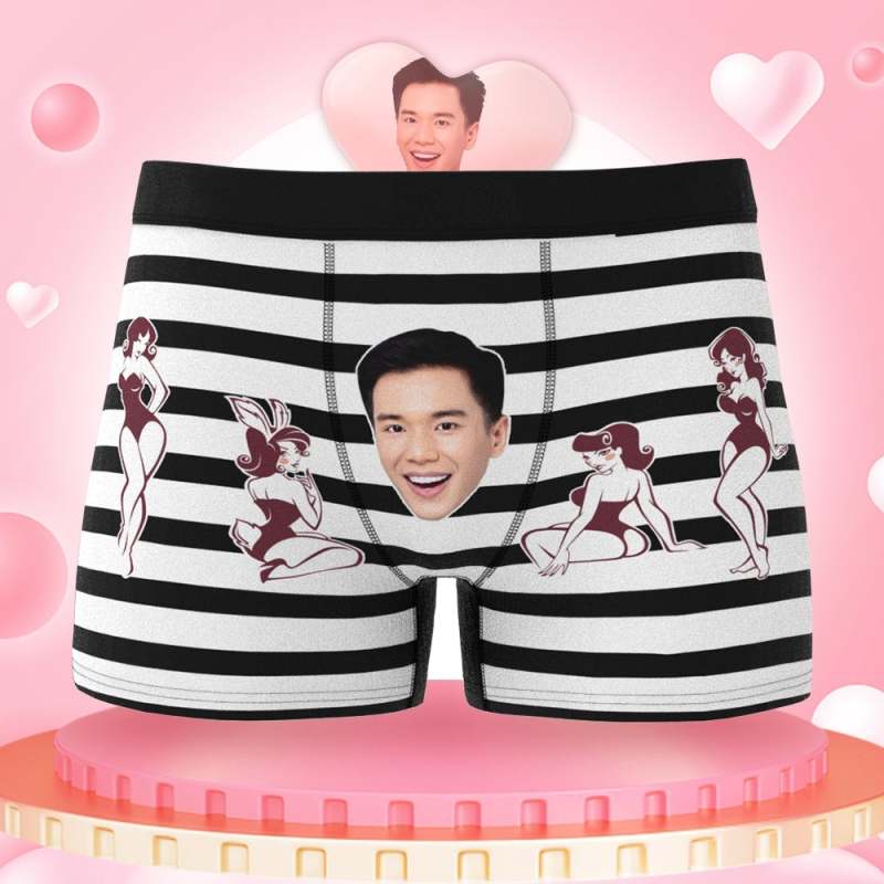 カスタムフォトボクサーパンツ-写真とテキスト入り可能なストライプと女の子柄のオリジナル下着バレンタインプレゼント