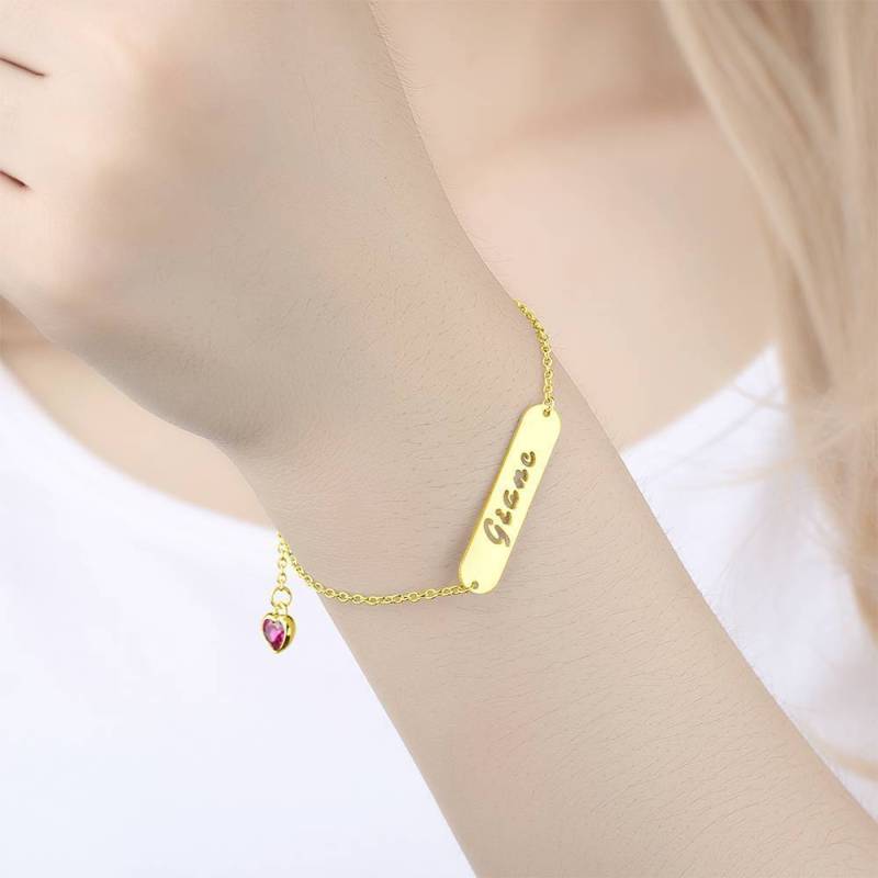 Hollow Carved Bar Name Bracelet with Heart-shaped Birthstone 14K Gold Plated Hollow Carved Bar Name Bracelet with Heart-shaped Birthstone 14K Gold Plated Hollow Carved Bar Name Bracelet with Heart-shaped Birthstone 14K Gold Plated